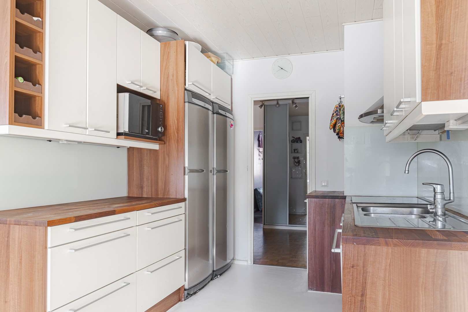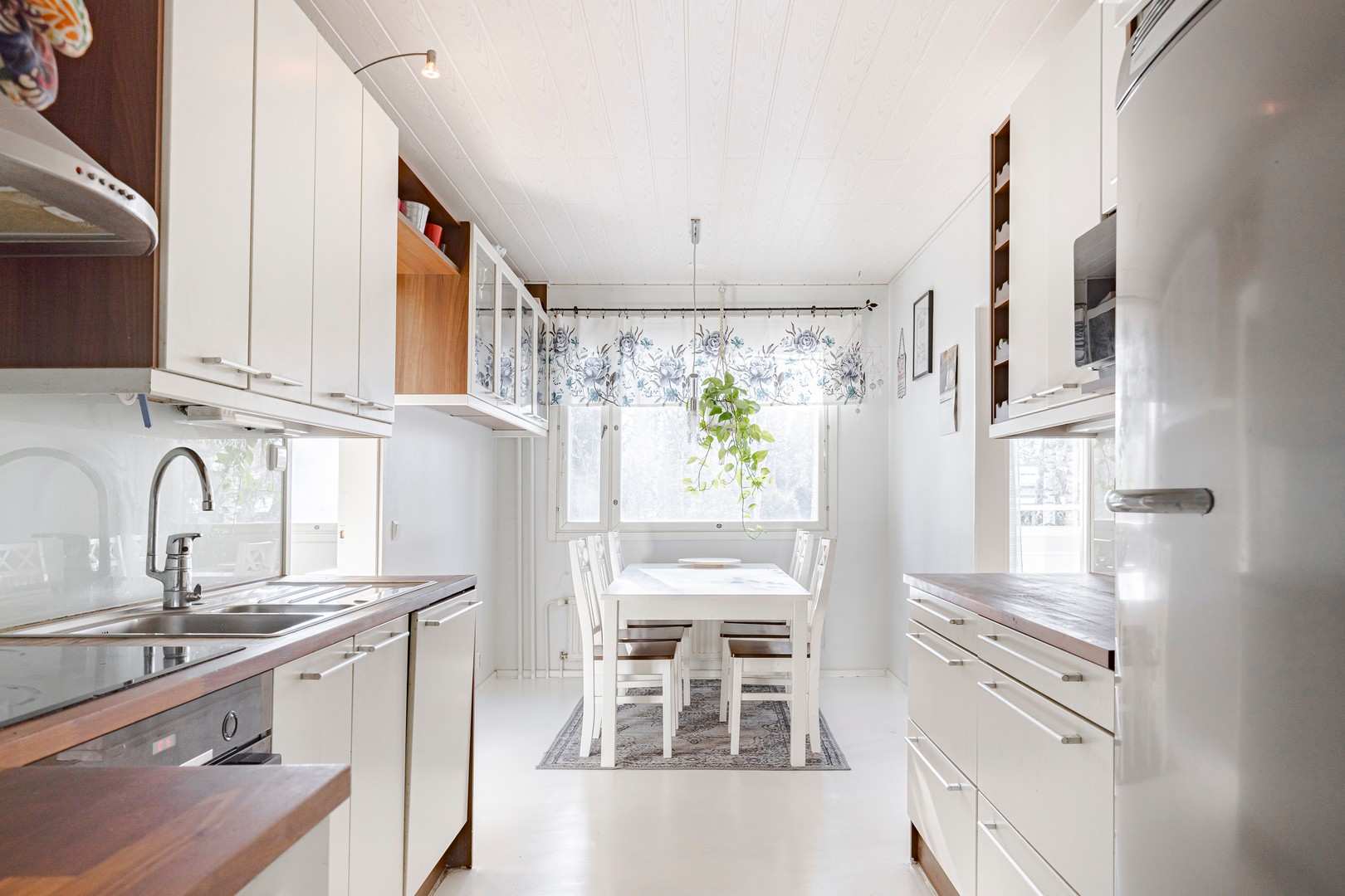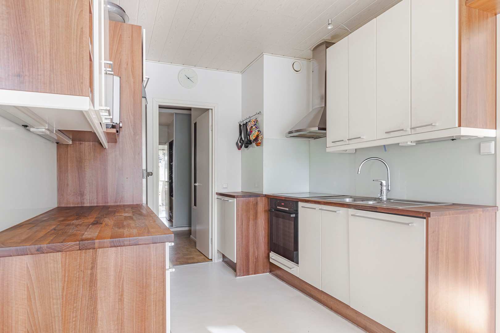 | Keittiön varustus | Keittiössä hyvin tilaa. Työtaso täyspuuta. Jääkaappi- ja erillinen pakastin, liesituuletin, astianpesukone, uuni ja liesi |