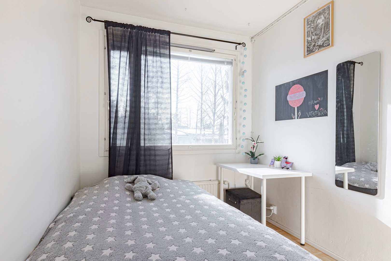 | Makuuhuone | Tilavia makuuhuoneita, näissä mahtuvat lapset harrastamaan ja viettämään vapaa-aikaa myös kavereiden kanssa. Makuuhuoneita on yhteensä 4 kpl, kaikkiin mahtuu parisänky. Kaksi on erittäin suuria, yksi hieman pienempi ja yksi on rakennettu jälkikäteen jakamaan iso olohuone. Myös tähän erikseen rakennettuun pienimpään huoneeseen mahtuu parisänky myös tässä huoneessa on ikkuna (tämän pienimmän erikseen rakennettu huoneen pinta-ala on alle 7m2, eli se ei ole siis virallisesti asuinhuone). Siinä mahtuu silti hyvin, jopa parisänky! |