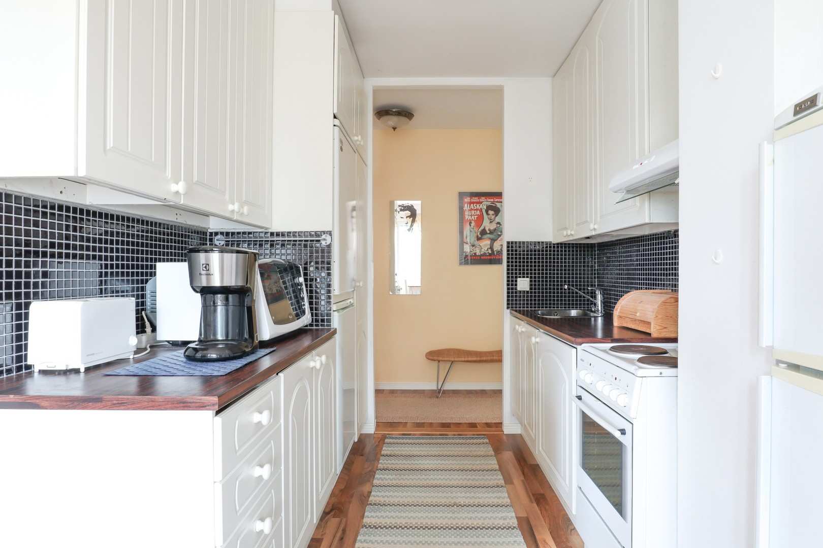 Asunnossa on keittiö johon mahtuu ruokailuryhmä. Keittiö on avoin olohuoneeseen. Ikkunat avautuvat puistoiseen maisemaan länteen. Pinnat siistit ja lattiassa laminaatti.