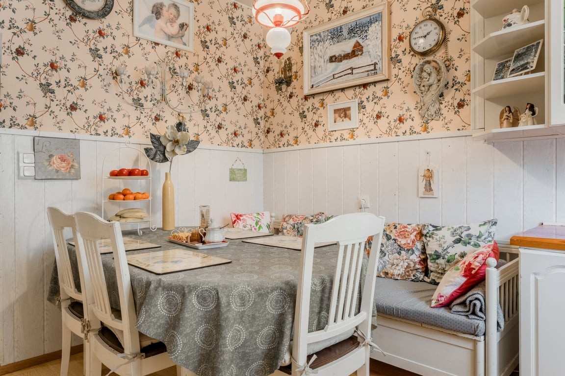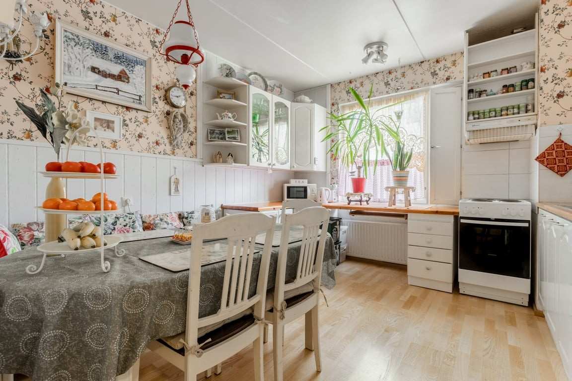 | Keittiön materiaalit | Lattia: lautaparkettia Seinät: Puu ja tapetti |