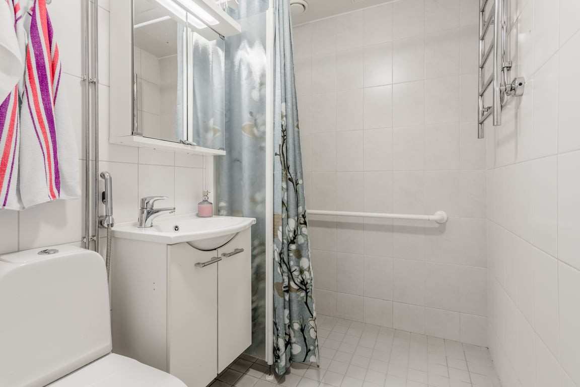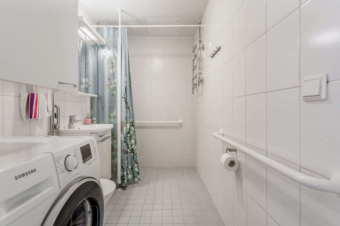| Kylpyhuoneen varusteet | WC-istuin, suihku, pesukoneliitäntä, peilikaappi, peili, pesuallas, allaskaappi, bidee-suihku, lattialämmitys ja suihkuseinä |
