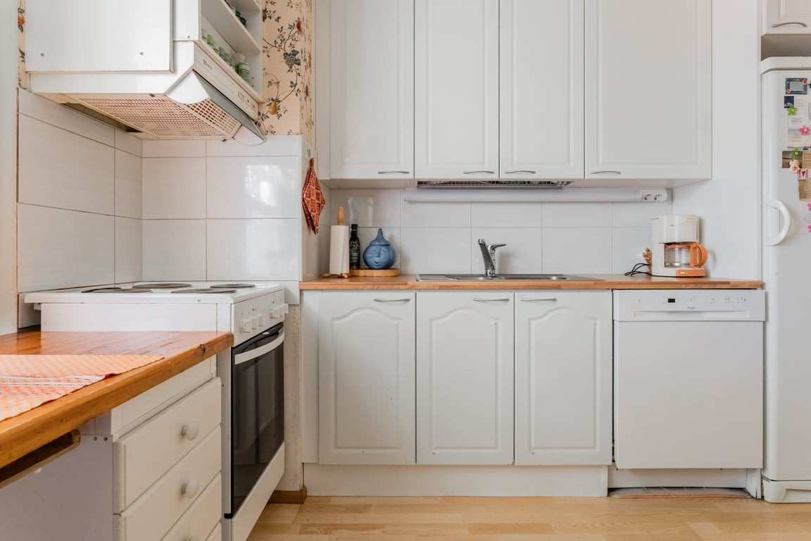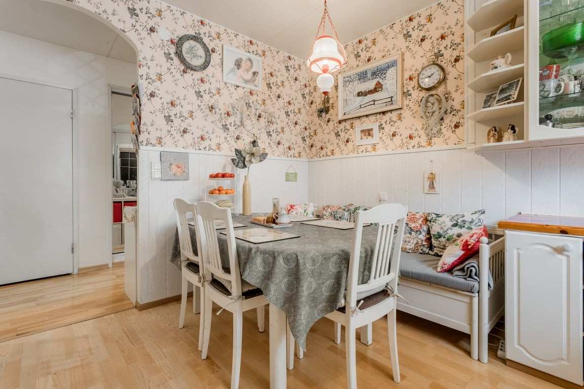 | Keittiön varustus | Viihtyisä keittiö, jossa seinät puolipaneloitu ja yläosassa mukavasti kuvioitu tapetti. Lattiat on lautaparkettia koko asunnossa. Jääkaappikapastin on juuri uusittu 07/2024. Liesi/uuni: Keraaminen liesi |