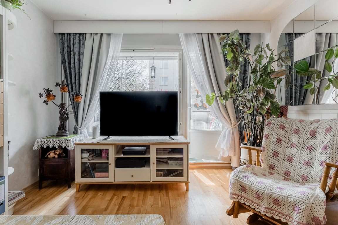 | Olohuone | Lattiat on lautaparkettia koko asunnossa. Olohuoneesta pääsy lasitetulle parvekkeelle. |