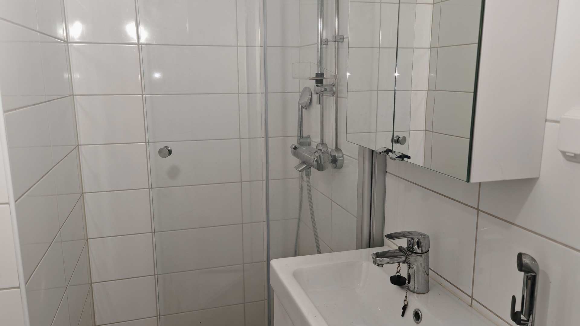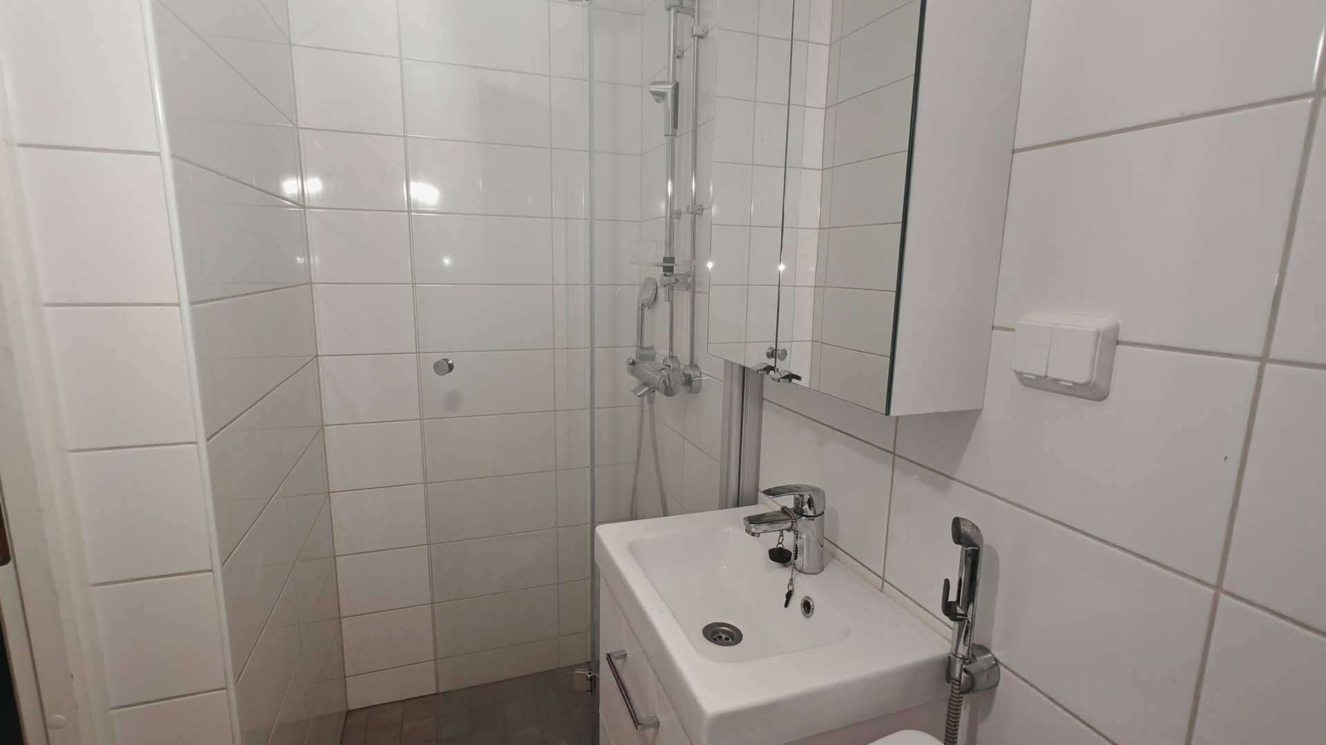 | Kylpyhuoneen varusteet | WC-istuin, suihku, suihkuseinä, pesukoneliitäntä, peilikaappi, pesuallas, allaskaappi ja bidee-suihku |