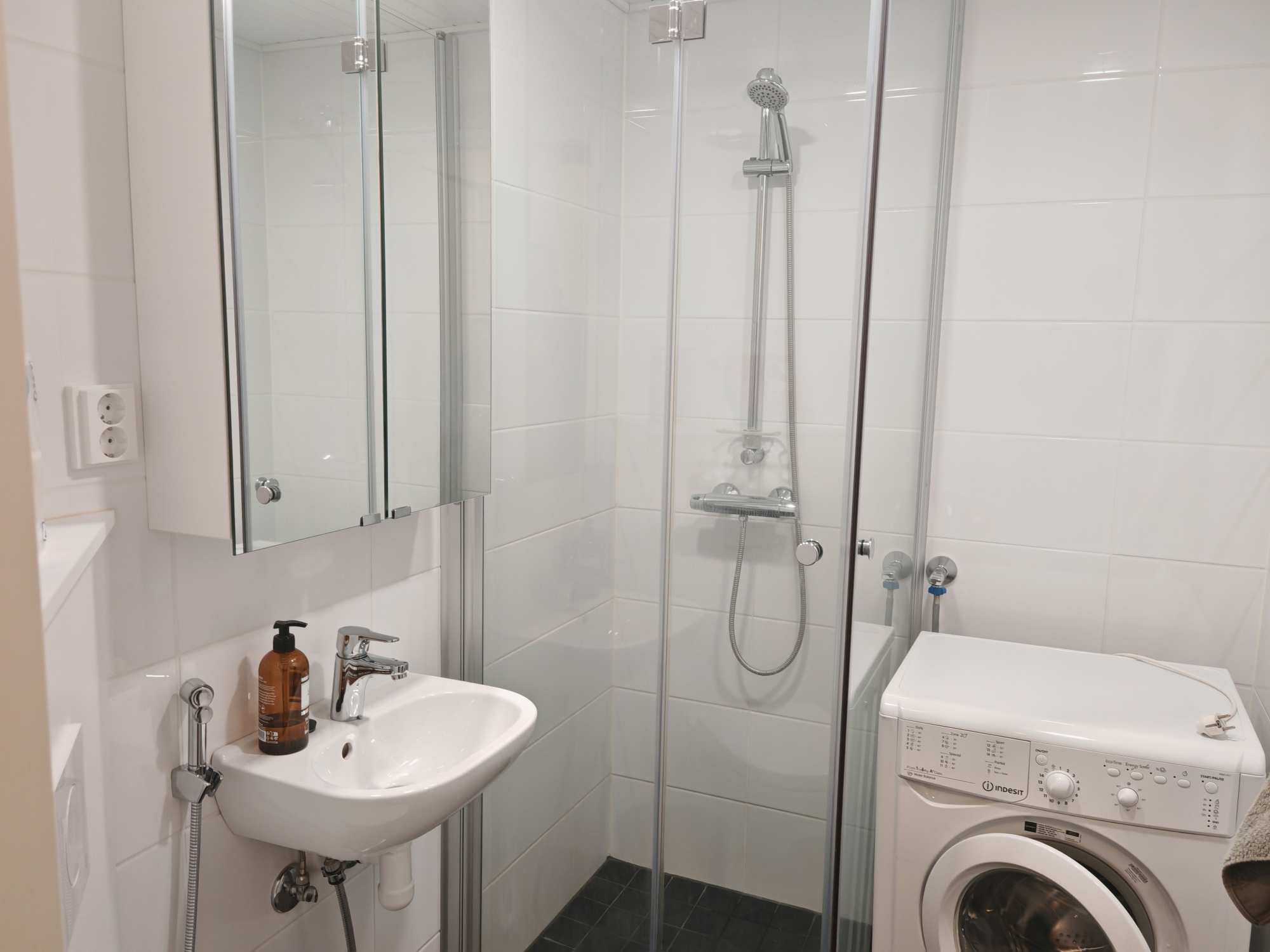 | Kylpyhuoneen varusteet | WC-istuin, suihku, suihkuseinä, pesukoneliitäntä, peilikaappi, pesuallas, allaskaappi, bidee-suihku ja lattialämmitys |