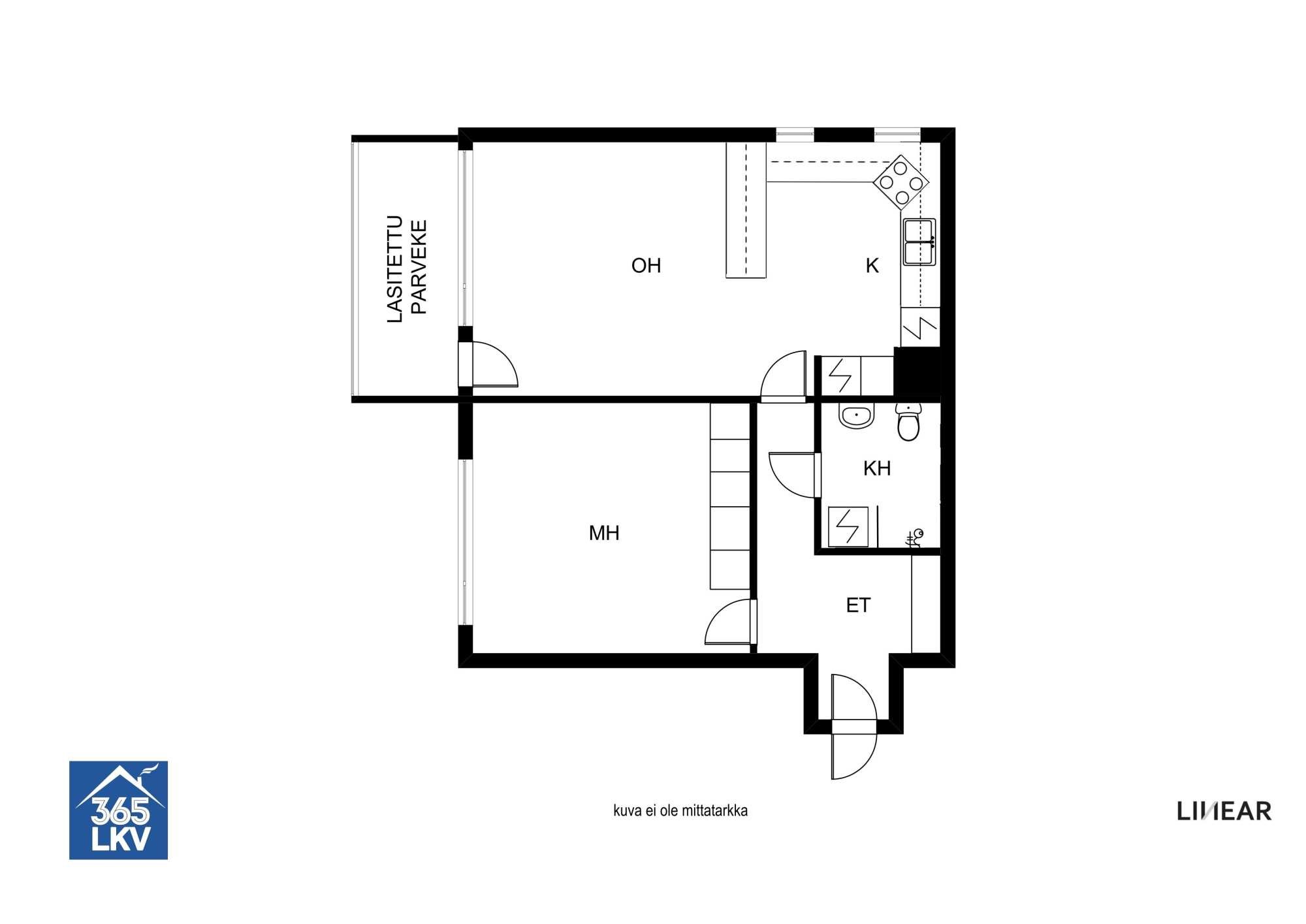+ Asunnossa on lasitettu parveke, tilava olohuone, makuuhuone, sekä tilava keittiö.