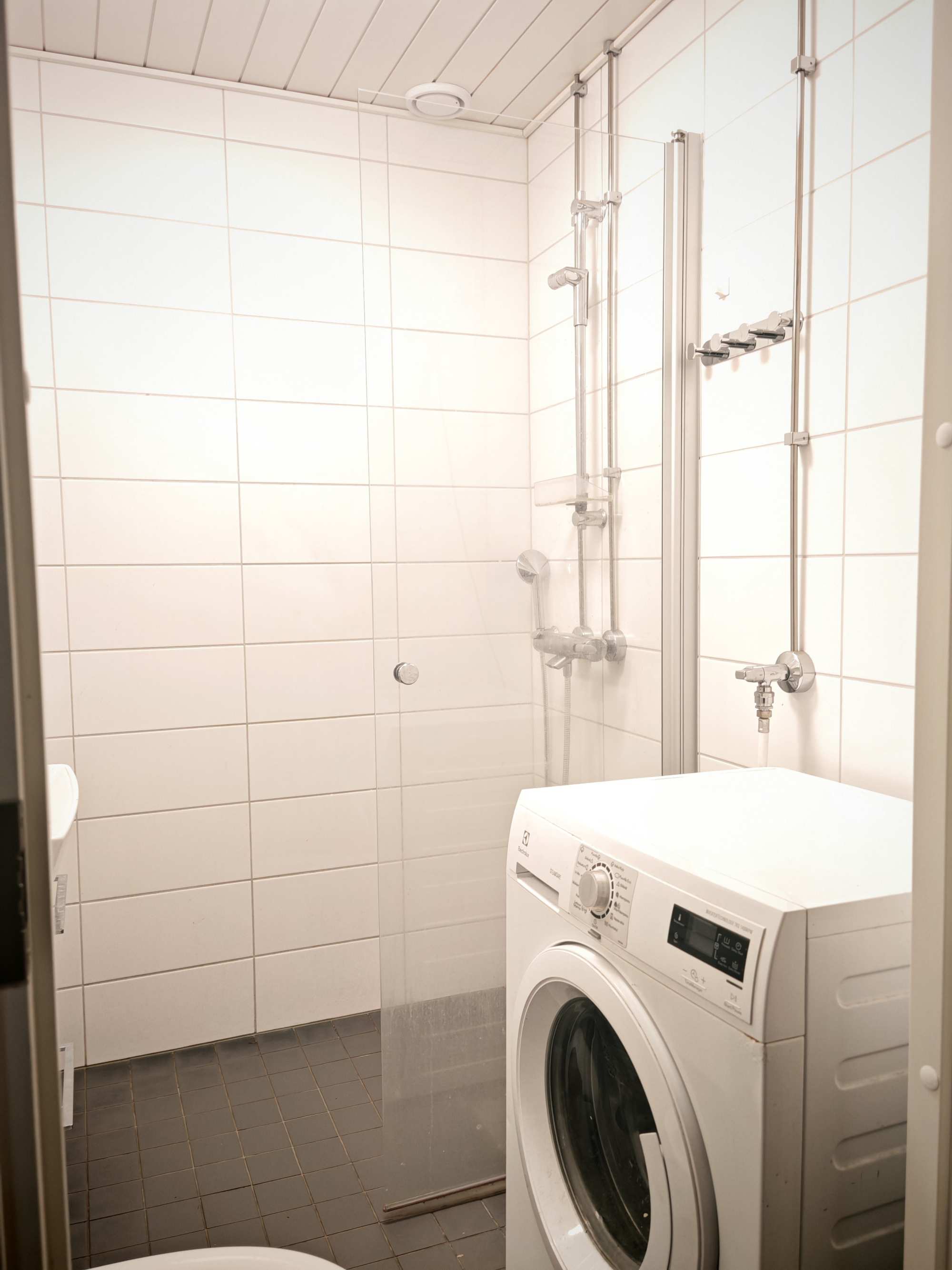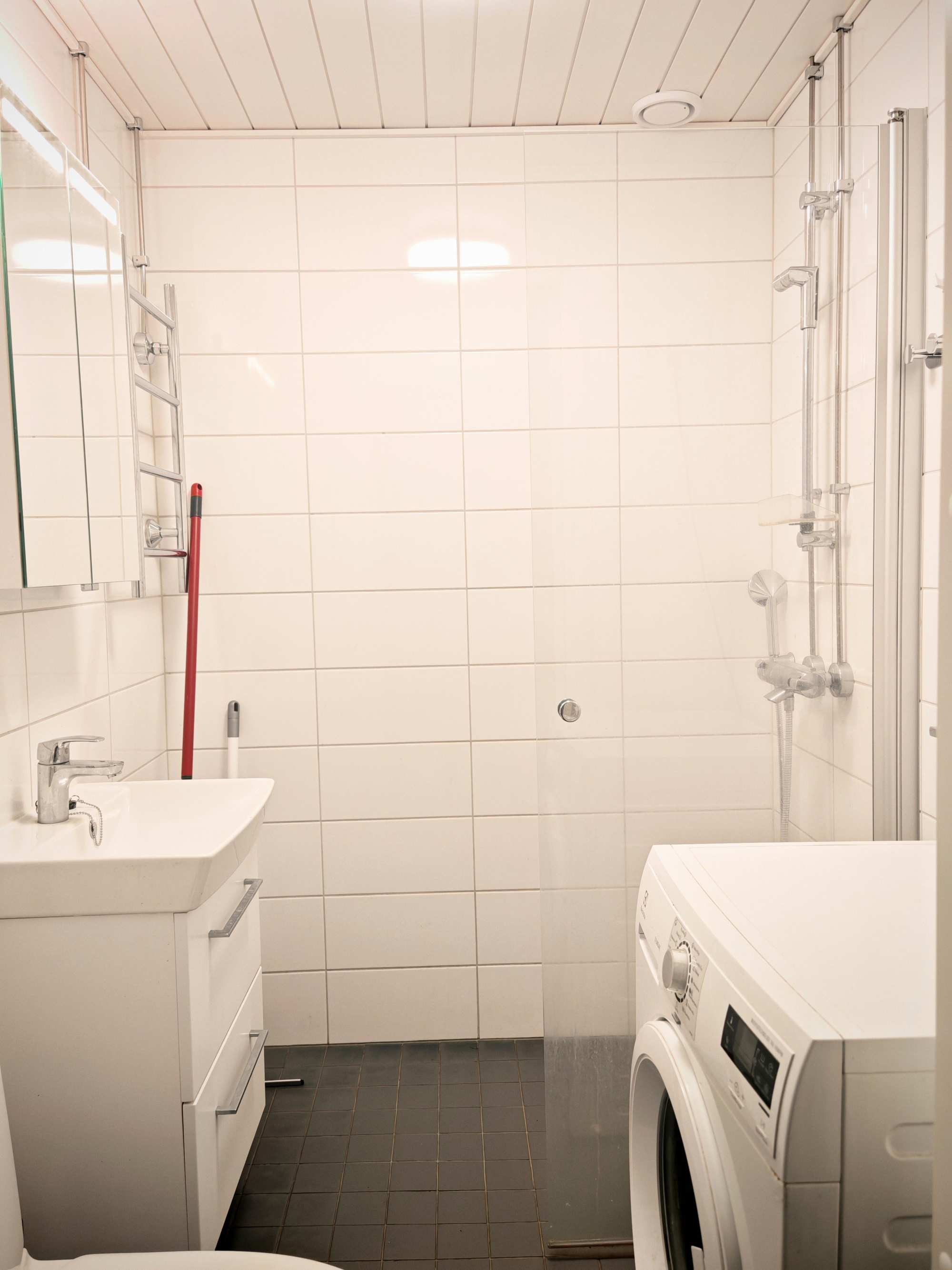 | Kylpyhuoneen varusteet | WC-istuin, suihku, suihkuseinä, pesukone, pesukoneliitäntä, peilikaappi, pesuallas, allaskaappi ja bidee-suihku |